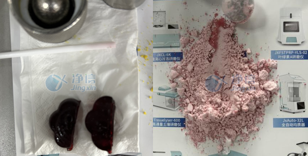 上圖為1分鐘的研磨效果,實驗結果顯示,軟糖樣品便已被研磨至細膩均勻的粉末狀,且一次可處理兩個樣品,極大地提高了工作效率。這一成果不僅證明了全自動樣品快速研磨儀在軟糖研磨中的卓越性能,也彰顯了其在復雜樣品處理方面的廣泛應用潛力。相比傳統方法,JXFSTPRP-24L不僅顯著提升了研磨效率,還確保了研磨效果的均一性和穩定性,為后續的成分分析提供了可靠保障。