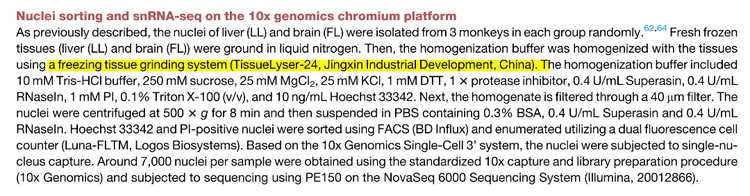 Tissuelyser-24L發(fā)揮了不可或缺的作用。研究團隊利用這種凈信的組織研磨儀,從雄性獼猴的肝臟和大腦中提取細胞核,為后續(xù)的單細胞RNA測序(snRNA-seq)分析奠定了基礎(chǔ)。通過精確的細胞核分離和高質(zhì)量的樣本制備,研究人員能夠深入探究二甲雙胍對細胞老化的具體影響,從而揭示了其在延緩衰老中的分子機制。