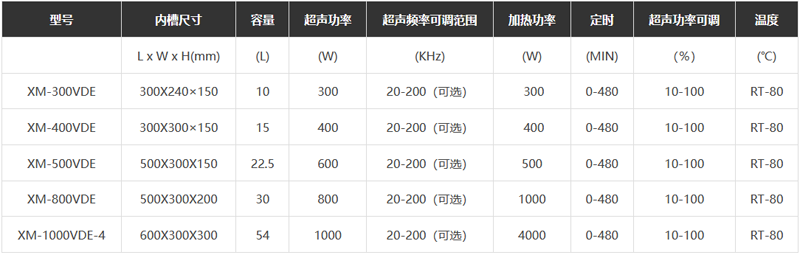 2、超聲功率及頻率:清洗機的每個超聲換能器發(fā)射功率為50W。超聲電功率10-100%任意調節(jié);超聲頻率可根據(jù)要求自動切換,可選切換頻率為三頻 四頻十一頻十三頻等(標準出廠模式為三頻),頻率可選調范圍:20-200KHz可選,符合藥典要求。